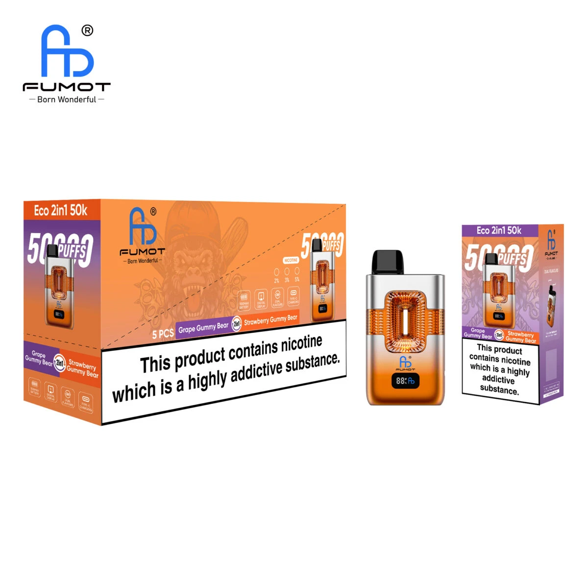Perchรฉ scegliere un orso? Il Fumot 50k ECO 2in1 50000 ti permette di passare istantaneamente dal gusto succoso dell'uva a quello classico delle caramelle gommose alla fragola.