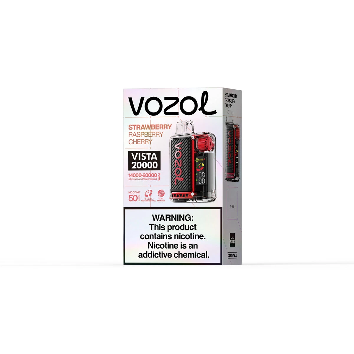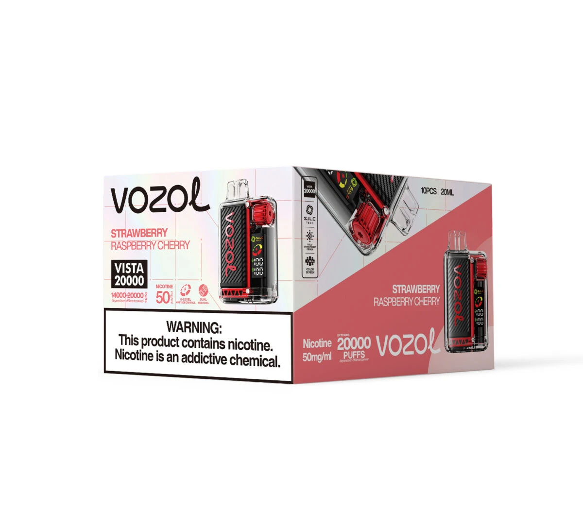 Un'esplosione di bacche rosse. Il VOZOL Vista 20000 Strawberry Raspberry Cherry riunisce tre frutti iconici per un profilo di bacche complesso, aspro e profondamente soddisfacente che domina la durata di 20.000 puff.