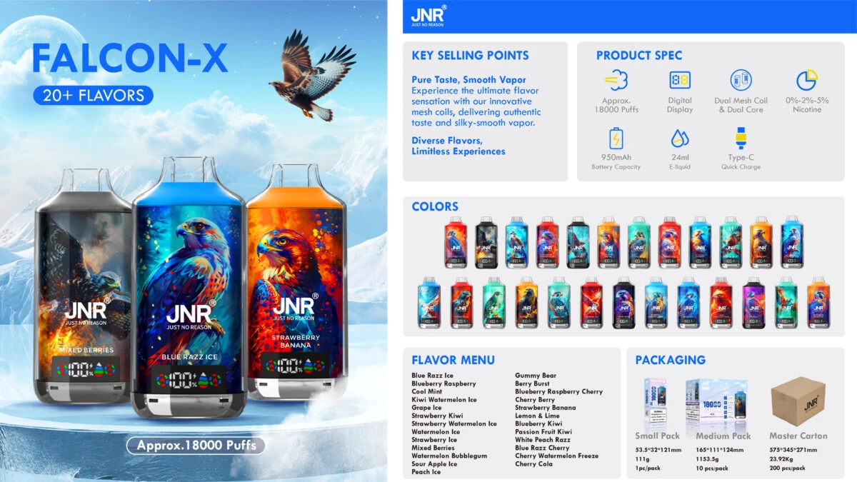 Welkom bij de toonaangevende productlijn van JNR Vape—de JNR Falcon X 18000. Dit apparaat is vakkundig ontworpen voor gebruikers en groothandels die extreme duurzaamheid, superieure smaak en efficiënte logistiek vereisen. Met een indrukwekkende capaciteit van Tot 18.000 Puffs, aangedreven door de revolutionaire Dual Core Dual Mesh Coil technologie, de JNR Falcon X 18000 herdefinieert de norm voor wegwerpbare vapes met hoge capaciteit. Slimme functies zoals de Digitaal display en Regelbare luchtstroom de gebruikerservaring verbeteren, terwijl onze 1-3 dagen expresslevering vanuit het Europese magazijn versterkt zijn positie als de voorkeurskeuze voor Europese jnr vape groothandels. Selecteer de puff jnr 18k voor een ongeëvenaarde houdbaarheid en smaak.