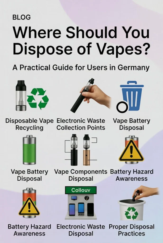Alla som använder vapes bör också tänka på korrekt avfallshantering. I Tyskland är det tydligt reglerat var vapes ska och inte ska slängas.